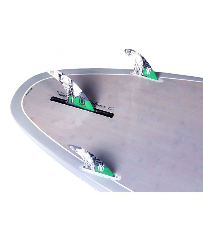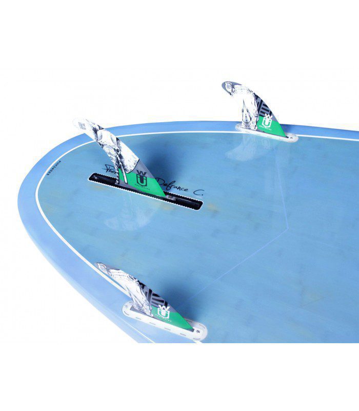 Hemos optado en esta tabla por una configuración de aleta enthruster (3 aletas) para una mayor variedad de opciones en función del uso de la tabla o del estado del mar. Se puede utilizar con tan solo la aleta central para favorecer la velocidad en paseo o con 3 aletas para incrementar la estabilidad, el agarre y el control en las surfeadas.