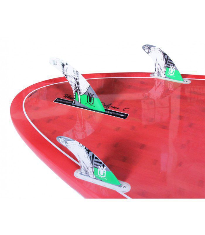 Hemos optado en esta tabla por una configuración de aleta enthruster (3 aletas) para una mayor variedad de opciones en función del uso de la tabla o del estado del mar. Se puede utilizar con tan solo la aleta central para favorecer la velocidad en paseo o con 3 aletas para incrementar la estabilidad, el agarre y el control en las surfeadas.