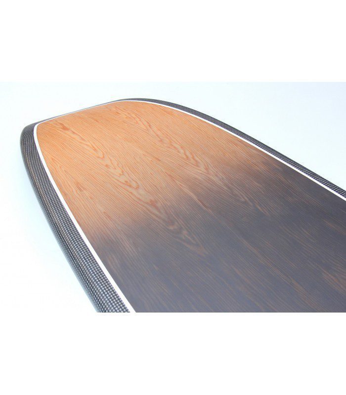 Tecnología 100% carbono innegra, núcleo EPS HD 15 kg/m3, fibra vidrio tri-axe, doble sandwich Madera Natural/PVC en todo el deck, refuerzos en varias zonas como tail, punta y cantos. Ridigez Stinger PVC de punta a punta de la tabla para incrementar la rigidez (mas ligero que el habitual stinger de madera). Fiabilidad Refuerzos PVC 90 kg/m3 alrededor del mango, de las cajas de aletas para una solidez y fiabilidad máxima. Aletas 4 aletas Future Fins en fibra de vidrio y honeycomb para optimizar el flex y reducir el peso.se puede montar en quad o trifins. Pad Deck pad con 2/3 con kicktail. Nueva densidad de espuma mas confortable y nueva superficie antideslizante para un mejor agarre. Madera Natural El uso de madera natural ha sido también determinante para incrementar la rigidez, la resistencia a los golpes y por su puesto para la estética de la tabla dándole un toque natural y puro. Es guapísima!