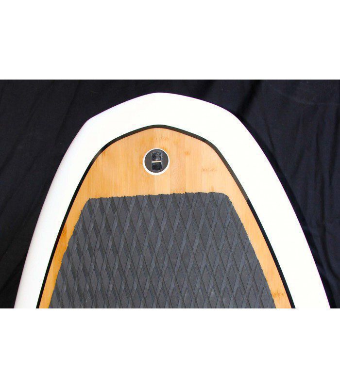 Este año usamos un foam/espuma mas ligero que nos permite ganar hasta 800 grs en este modelo. Con esto hemos podido reforzar la construcción añadiendo una capa mas de fibra de 6oz en el puente de la tabla. La capa de bamboo, en sandwich al vacio, es ahora mas gruesa (pasamos de 0,6 à 0,8 mm) lo que nos permite obtener una tabla mas rigida bajo los pies, mas dura a los impacto y menos sujeta a la deforación a la altura de los pies. Una tabla super polivalente y facil de llevar cual sea el estado del mar.