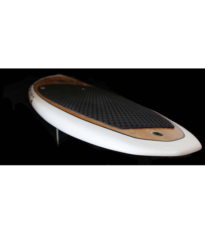 Este año usamos un foam/espuma mas ligero que nos permite ganar hasta 800 grs en este modelo. Con esto hemos podido reforzar la construcción añadiendo una capa mas de fibra de 6oz en el puente de la tabla. La capa de bamboo, en sandwich al vacio, es ahora mas gruesa (pasamos de 0,6 à 0,8 mm) lo que nos permite obtener una tabla mas rigida bajo los pies, mas dura a los impacto y menos sujeta a la deforación a la altura de los pies. Una tabla super polivalente y facil de llevar cual sea el estado del mar.
