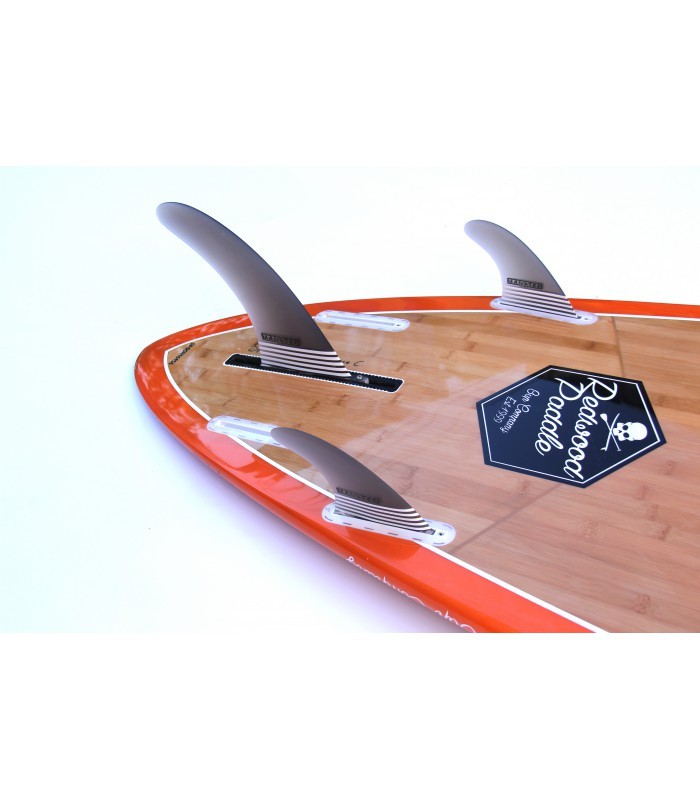 Sandwich Fibra vidrio tri-axe, búcleo EPS HD 15 kg/m3, doble sandwich bamboo y PVC en todo el deck, Sandwich bamboo en carena, multiples refuerzos en varias zonas como tail, punta y cantos. Ridigez Stinger PVC de punta a punta de la tabla para incrementar la rigidez (mas ligero que el habitual stinger de madera). Fiabilidad Refuerzos PVC 90 kg/m3 alrededor del mango, de las cajas de aletas para una solidez y fiabilidad máxima. Aletas Central US box en fibra de vidrio y 2 aletas Future Fins en los laterales con fibra de vidrio y honeycomb para optimizar el flex y reducir el peso. Pad Se entrega sin Deck pad. Puro Longboard Style. Bamboo El uso del bamboo ha sido también determinante para incrementar la rigidez, la resistencia a los golpes y por su puesto para la estética de la tabla dándole un toque natural y puro. Es guapísima!