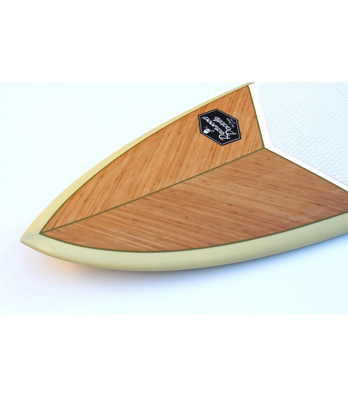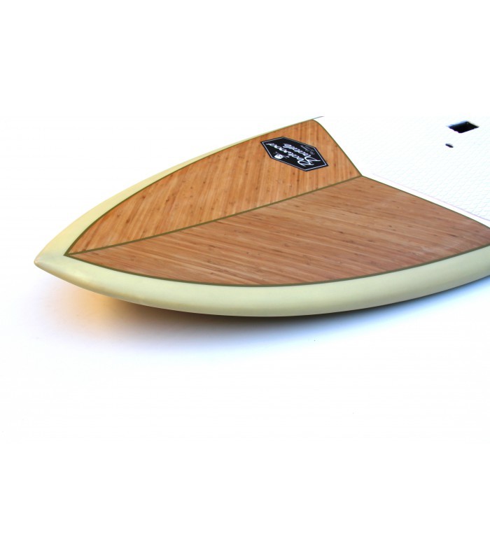Sandwich Fibra vidrio tri-axe, búcleo EPS HD 15 kg/m3, doble sandwich bamboo y PVC en todo el deck, Sandwich bamboo en carena, multiples refuerzos en varias zonas como tail, punta y cantos. Ridigez Stinger PVC de punta a punta de la tabla para incrementar la rigidez (mas ligero que el habitual stinger de madera). Fiabilidad Refuerzos PVC 90 kg/m3 alrededor del mango, de las cajas de aletas para una solidez y fiabilidad máxima. Aletas Configuración Quad. Se entrega con un juego de 4 aletas en fibra de vidrio y honeycomb para optimizar el flex y reducir el peso. Pad Deck pad con 2/3 con kicktail. Nueva densidad de espuma mas confortable y nueva superficie antideslizante para un mejor agarre. Bamboo El uso del bamboo ha sido también determinante para incrementar la rigidez, la resistencia a los golpes y por su puesto para la estética de la tabla dándole un toque natural y puro. Es guapísima!