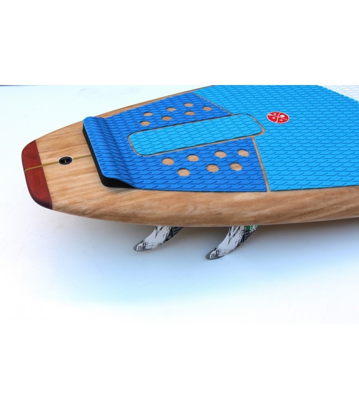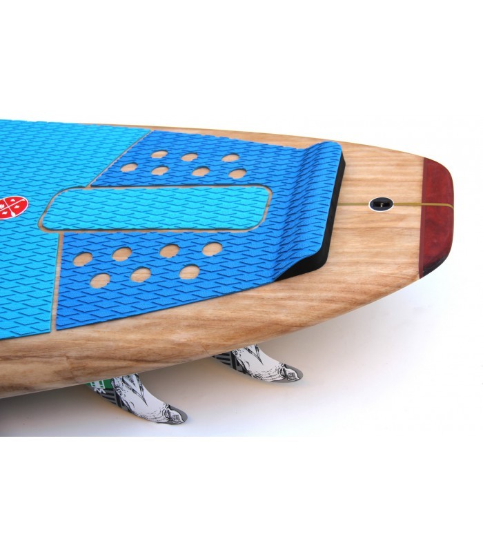Sandwich Fibra vidrio tri-axe, búcleo EPS HD 15 kg/m3, doble sandwich paulownia y PVC en todo el deck, Sandwich bamboo en carena, multiples refuerzos en varias zonas como tail, punta y cantos. Ridigez Stinger PVC de punta a punta de la tabla para incrementar la rigidez (mas ligero que el habitual stinger de madera). Fiabilidad Refuerzos PVC 90 kg/m3 alrededor del mango, de las cajas de aletas para una solidez y fiabilidad máxima. Aletas Configuración Quad. Se entrega con un juego de 4 aletas en fibra de vidrio y honeycomb para optimizar el flex y reducir el peso. Pad Deck pad con 2/3 con kicktail. Nueva densidad de espuma mas confortable y nueva superficie antideslizante para un mejor agarre. Bamboo El uso del bamboo ha sido también determinante para incrementar la rigidez, la resistencia a los golpes y por su puesto para la estética de la tabla dándole un toque natural y puro. Es guapísima!