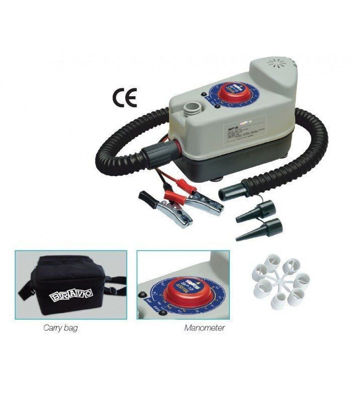 El hinchador se puede conectar a una bateria de coche o con cualquier otra bateria de 12V gracias a las pinzas. Se puede utlizar también con una batería Bravo BK 120/230 V en opción. Autonomia del hinchador con batería es de 20 minutos.